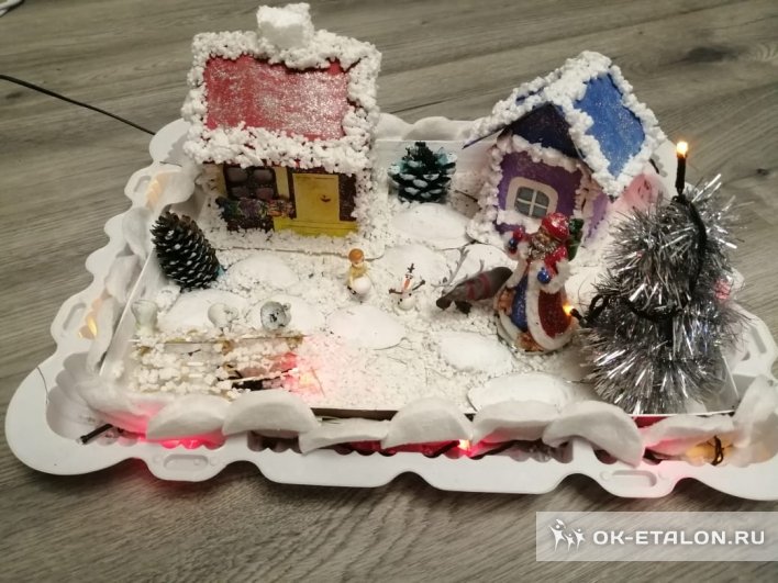 Эх, деревня деревушка!Три дороги, два двора.Снегом занесло избушки,Здравствуй, Матушка Зима!!!Для участия в новогоднем конкурсе "Новогодний фестиваль зимних поделок" на базе своего детского сада, я изготовила новогоднюю деревню. Идея пришла давно и мы вместе с детьми воплотили нашу фантазию в жизнь. Вот что получилось!Нам понадобился материал:- контейнер для торта- пенопласт- потолочная плитка- шишки-...