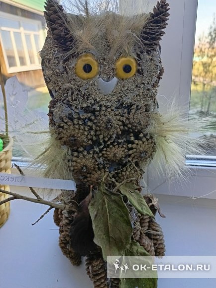 Для изготовления поделки использовались такие маленькие как шишки, сухие листья деревьев, сухая трава, мох, ветки и пластиковые крышки.