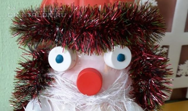 Кормушка выполнена из 5ти литровой бутылки для воды, пластмассовых ложек, крыжек от бутылок, клейкой ленты, красок и мишуры. Кормушка сделана в виде Деда Мороза.