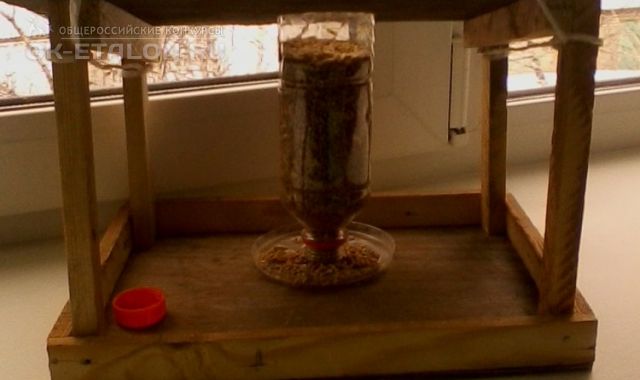 Кормушка для птиц сделана на уроках технологии из подручных средств: дерева, фанеры, пластиковой бутылочки. Подача корма автоматическая. Это практично, лишний корм не просыпается.