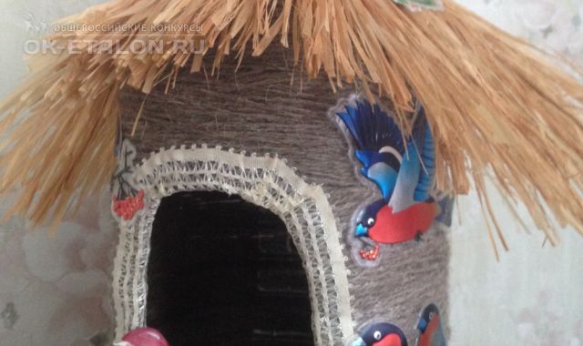 Кормушка выполнена из гофрированного картона. Все части кормушки соединены между собой при помощи термопистолета. На передней и задней стенке в центре вырезаны отверстия для птичек. Кормушка оформлена элементами декора из бросового материала (пробки, искусственные цветы), стены и крыша кормушки окрашены в розовый и фиолетовый цвета. На передней стенке, вверху декор в виде птицы (выполнен из фанеры). Время ... показать полностью