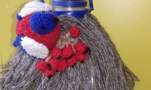 В рамках проекта "Трудно птицам зимовать. Надо птицам помогать!" обновили старые кормушки для птиц и сделали несколько новых. Основа кормушки - 5-ти литровая пластиковая бутылка. При помощи термопистолета обклеили её плотными нитками. Связали снегиря и веточку рябины и украсили ими кормушку.