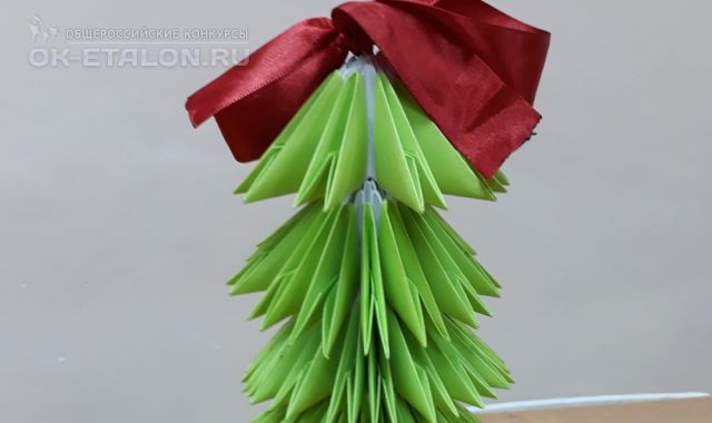 Ёлочка выполнена в технике модульного оригами. Каждый ярус ёлочки собирается отдельно. Из яруса в ярус постепенно расширяясь. Ёлочка состоит из их 6 ярусов. Берётся шпажка, на которую нанизываются готовые заготовки нашей ёлочки. Вот такая пышная ёлочка получилась.