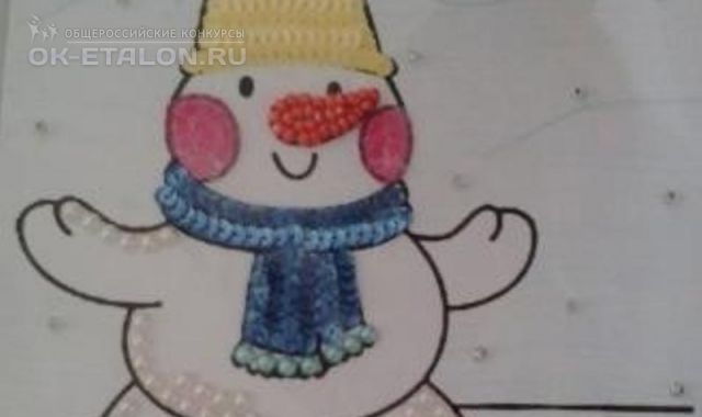 Работа выполнена приклеиванием бусин и паеток на трафарет снеговика.