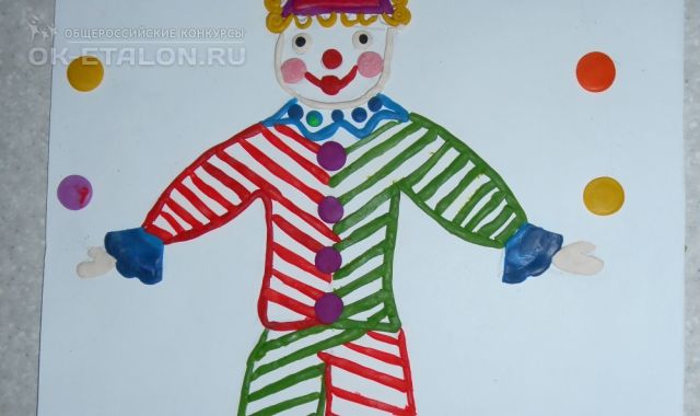 Данная работа "Весёлый клоун" изготовлена, в основном, из пластилиновых жгутиков. Оборки на рукавах, штанах, а также туфли выполнены методом размазывания пластилина по контуру. Пуговицы и мячи - сплющивание скатанных шариков пластилина. Время работы - 1 час. В итоге, вот такой весёлый клоун получился.