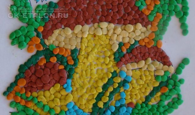 Работа сделана в технике пластилинографии. Девочка работала в течении двух недель переодически заменяя неполучившиеся на новые.