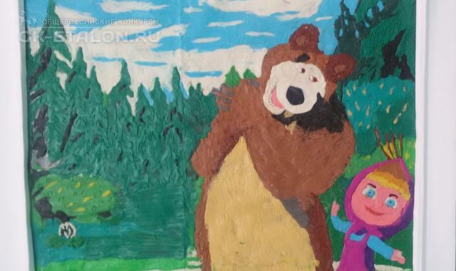 Название работы "Маша и медведь". Работа полностью выполнена из пластилина. Рамка из бумаги.