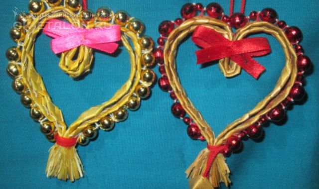Делать такие сердечки из соломы меня научила бабушка. Берём 3 проглаженных соломинки и сплетаем косичку. Для 1 сердечка нужны 2 косички. Соединяем косички и концы связываем ниткой. Создаем форму сердечка. Я пришил к серединке бантик из ленточки. Украсил сердечко бусами. Можно без бус. На 1 сердечко времени уходит минут 20-30. Главное, что почти нет материальных затрат. А сувенир такой красивый, светлый, сол... показать полностью