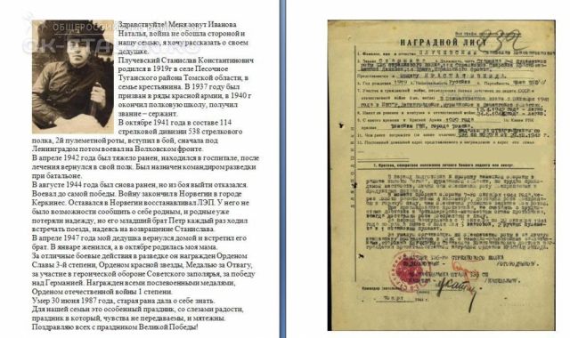 Это отрывок из наградного листа моего прадедушки Скареднова Николая Егоровича. За свой подвиг он был награжден Орденом Славы III степени. Я ГОРЖУСЬ СВОИМ ПРАДЕДУШКОЙ И БЛАГОДАРЕН ЕМУ ЗА СВОЁ СЧАСТЛИВОЕ ДЕТСТВО!