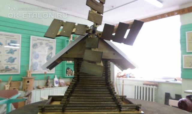 Кормушка "Мельница" выполнена из деревянных палочек, между которыми имеется щель. Покрашена морилкой. Крыша кормушки снимается (засыпаются семена).
