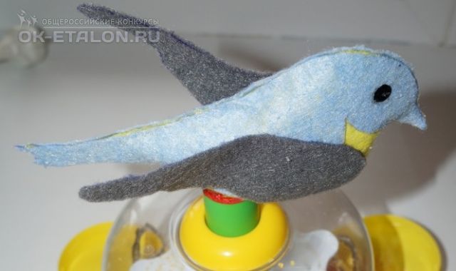 "Кормушка из игрушки", сделали мы эту кормушку из старой юлы с трещиной и крышек от баночек какао, механизм юлы поможет разбрасывать корм к окошечку, в такой кормушке корм не намокнет в дождливую погоду и ветер его не сдует, птичку сшили из фетра.