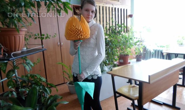 "Тюльпанчик для мамы" выполнен на 8 марта в технике модульного оригами. Стебель и лист сделаны из гофрированной бумаги. В основе стебля алюминиевая палка. На изготовление цветка пошло 258 модулей из цветной офисной бумаги.
