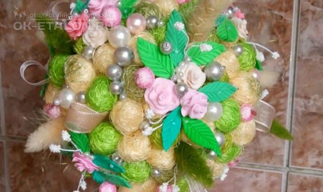 "Весенняя нежность". При изготовлении топиария использовалась смешанная техника: работа с сизалем; лепка из пластики; оформление чешскими бусами и лагурусом. Цветочный горшок был отдекорирован шпагатом и цветами из пластики.