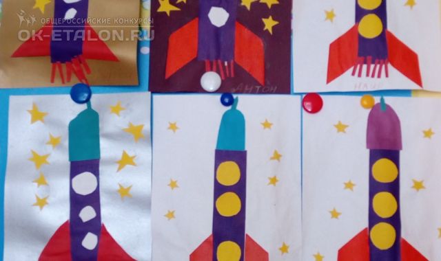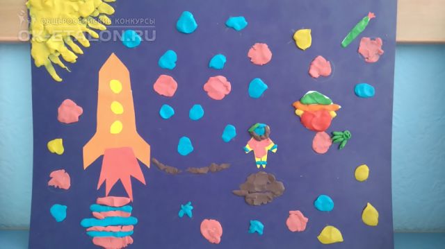 Данная работа выполнялась 12 апреля 2017 года в рамках комплексного занятия по аппликации и лепке в подготовительной группе, посвященного Дню космонавтики. Этому предшествовала работа по изучению космоса: Солнечной системы, работы космонавтов в условиях открытого космоса и т.д. Дети проявили большой интерес к данной теме, что нашло отражение в их работах.