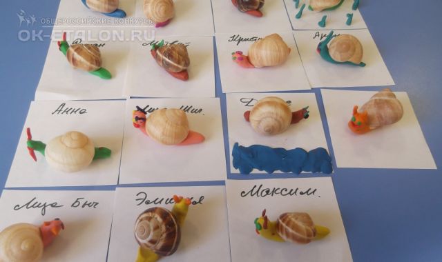 В нашей лаборатории много разных природных материалов (разные ракушки, песок, камушки... в том числе и панцири от улиток. Мы решили дать вторую жизнь улиткам. Из пластилина мы слепили тело улиткам, а домики у нас уже были. Вот так у нас получилась целая семья улиток папа и мама, братья и сестры, бабушки и дедушки. Дети придумали сказку "Дружная семья" и проигрывали её.