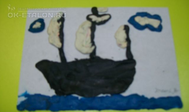 Работа выполнена на занятии по лепке по теме сказки А.С. Пушкина "Ветер по морю гуляет и кораблик подгоняет"